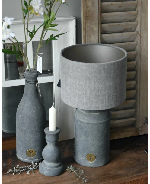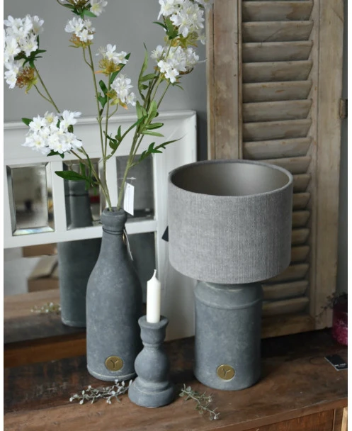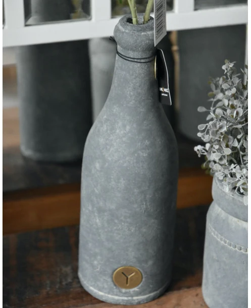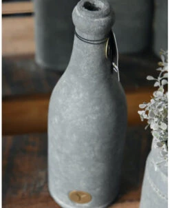 Aardewerk fles Majestic grijs, Brynxz. Dit leuke model fles is van aardewerk met een grijze Majestic afwerking. Het onderste gedeelte is recht opgaand met naar boven een verloop naar een smalle tuit/opening. Aan de voorzijde zit het logo verwerkt en op de fles zit een kurk, maar zonder met een mooie tak erin staat ook erg mooi. Wat ook een leuke optie is om de fles als kandelaar te gebruiken met een mooie tafelkaars. U kunt de fles goed combineren met de andere producten zoals potten en kandelaren uit de Majestic serie.