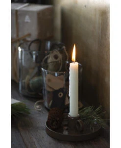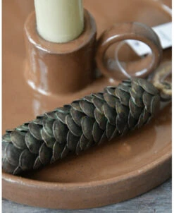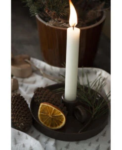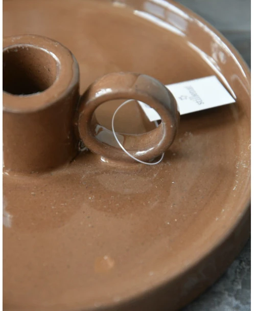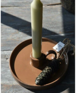 Aardewerk kandelaar met oor bruin, IB Laursen. Deze kandelaar heeft een echte vintage look. Het mooie materiaal en het model is heel herkenbaar en toch ook echt van nu. De kandelaar is van aardewerk met een licht glanzende afwerking in het bruin, de ‘druip’ schotel is plat met een opstaand randje en een kaarsen inzet met oor. In de kandelaar past een normale tafelkaars (2,2 cm diameter). Zowel de korte als de lange tafelkaarsen staan erg mooi in dit model.