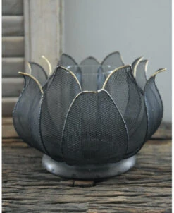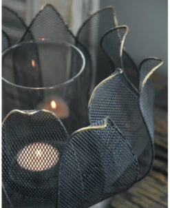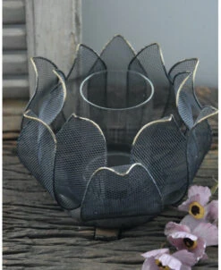 Artisjok model windlicht per stuk. Dit prachtige Artisjok model windlicht heeft verschillende aparte bladeren van metaal met in de punten een antiek gouden accent. De bladeren samen vormen het windlicht met in het hart een glas waar u de kaars in kan branden. Doordat de bladeren van metaal zijn vol met een gaatjes ontstaat er een mooie effect wanneer er een kaars in wordt gebrand.