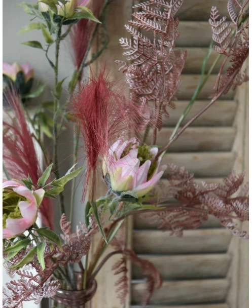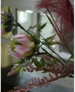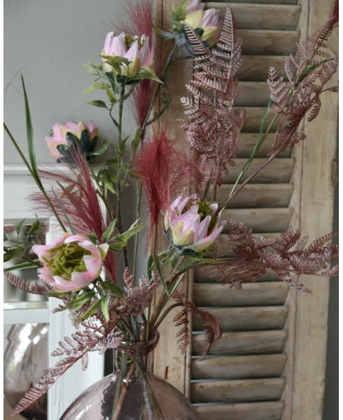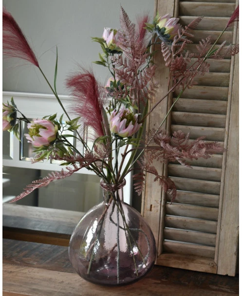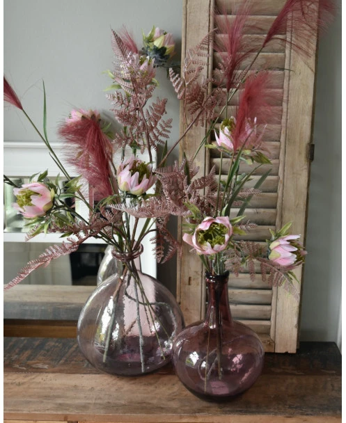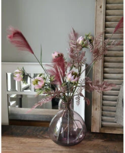 Ballon vaas met boeket in malva roze groot. Deze prachtige ballon vaas met malva roze gloed is opgemaakt met een boeket zijde/kunst bloemen in de roze kleurschakering. In de ballonvaas zitten sierlijke pluimen, vertakte Protea’s en een malva roze vertakte Varen tak. U kunt het geheel zo neerzetten op een mooie plek in huis. (Ook is er een kleinere variant van dit geheel, zolang de voorraad strekt).