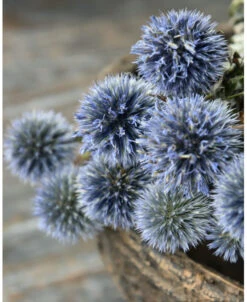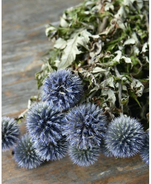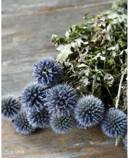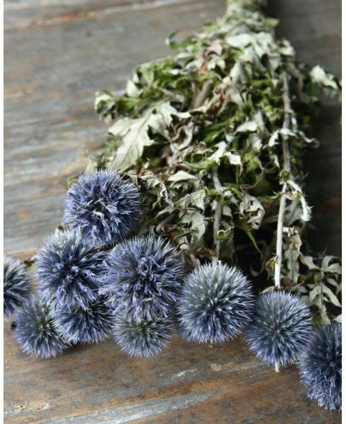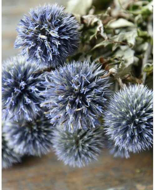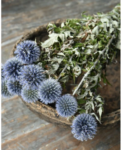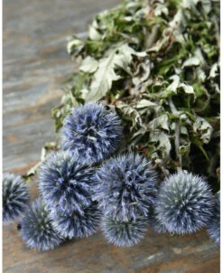 blauwe gedroogde Kogeldistels. Deze prachtige Distels hebben een rond gevormde bloem in een mooie kleur blauw. De distels staan erg mooi op zink of een grijze kan bijvoorbeeld. Iedere bos is uniek in kleur en de grote van de bloemen en de hoeveelheid ervan. Deze prachtige Echinops/Kogeldistels zijn puur natuur.