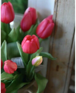 Bos diep roze tulpen real touch, a 5 stuks. Deze prachtige zijde/kunst tulpen hebben een intens diep roze kleur. De real touch tulpen voelen bijna echt, en zijn ook vrij zwaar (zoals echte tulpen ook zijn). De bos tulpen is zoals in de natuur net in verschillende stadia van bloei. U kunt de tulpen zo op een vaasje zetten en lang genieten van deze mooie voorjaarsbloeier.