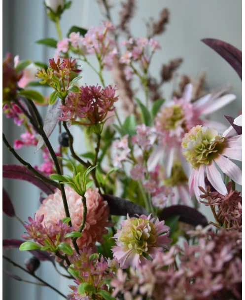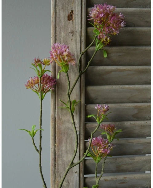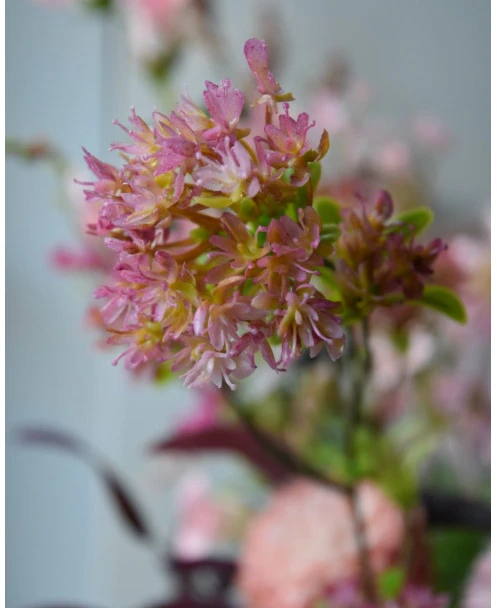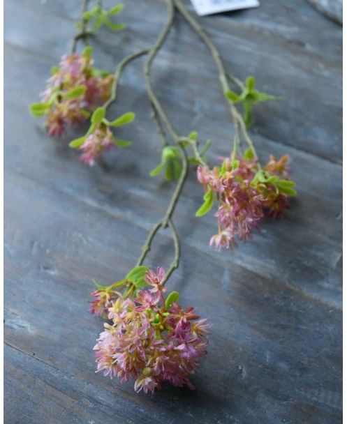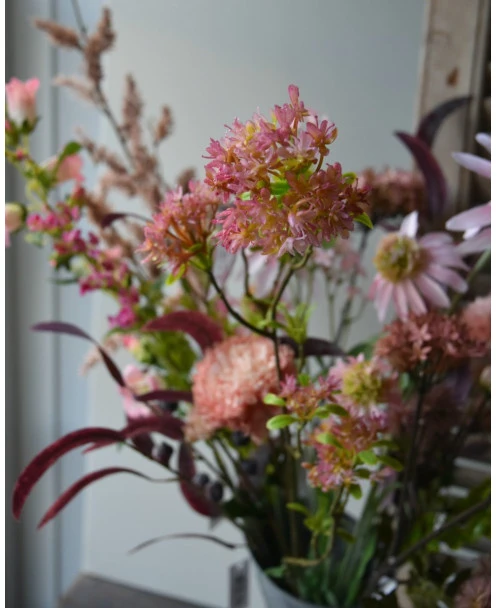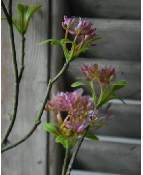 Bouvardia bloesemtak in roze, Brynxz. Deze mooie zijde/kunst houtige bloesem tak heeft bloesem trossen van de Bouvardia die een mooie gemêleerde roze violet achtige kleur hebben. De tak is mooi vertakt en u kunt ze nog iets in de gewenste positie buigen zodat ze mooi tot hun recht komen. De tak’ken’ staan solide mooi in een grote kan of vaas, of gemengd in een boeket met andere zijde/kunst bloemen.