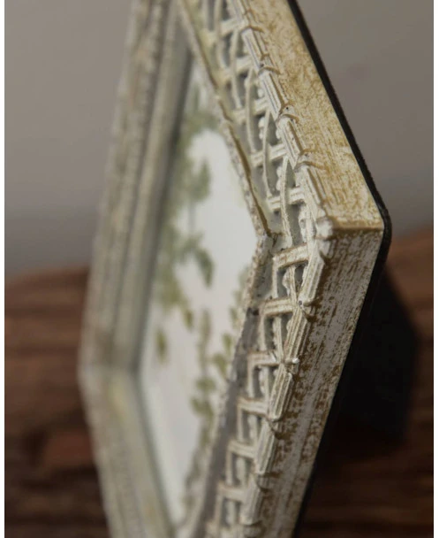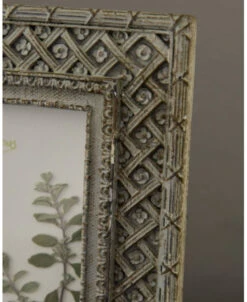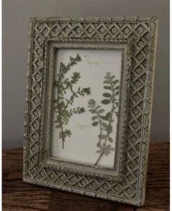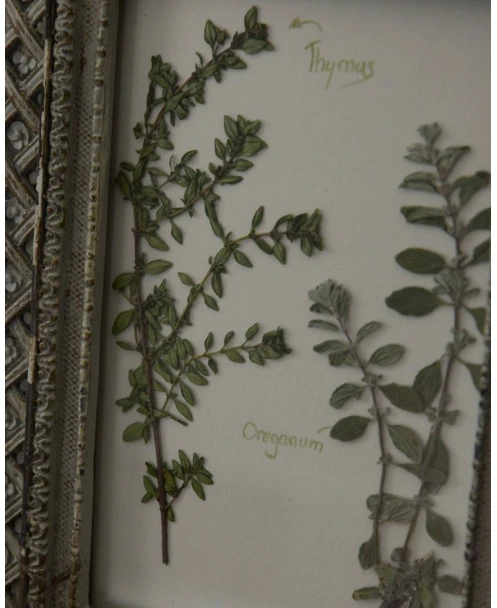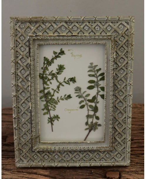 Brocante lijstje met geperst kruiden. Dit prachtige lijstje heeft een olijfgroen/grijze kleur en met een prachtig patroon van bloemetjes en een gevlochten ruitvormig patroon. In de lijst zijn geperste gedroogde kruide geplaatst. De kruiden die gebruikt zijn, zijn Thymus (Thijm) en Oreganum (Oregano). Het lijstje kunt u zowel ophangen als neerzetten. Het lijstje is van het merk Clayre & eef.