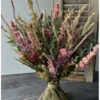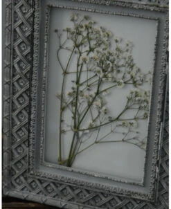 Brocante lijstje met gewerkte rand, Gipskruid. Dit prachtige lijstje heeft een rand van een ruitpatroon met bloemetje. Het llijstje is gevuld met geperst Gipskruid. De achterzijde van het lijstje is zwart en het kan zowel staand als hangend worden gedecoreerd. Het lijstje is van het merk Clayre en Eef.