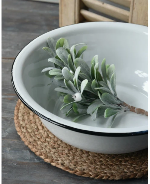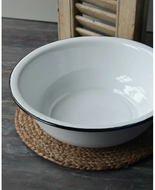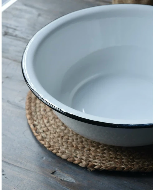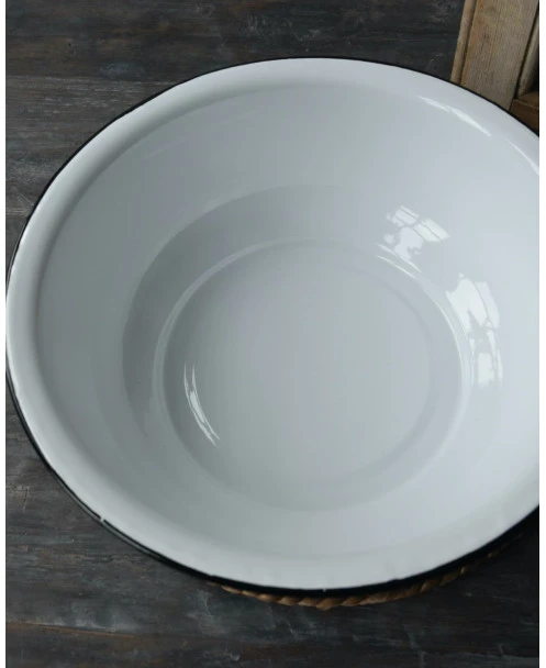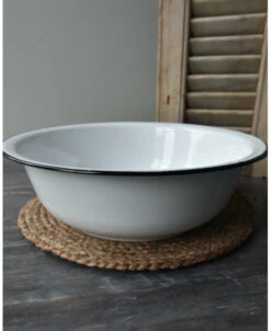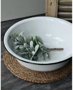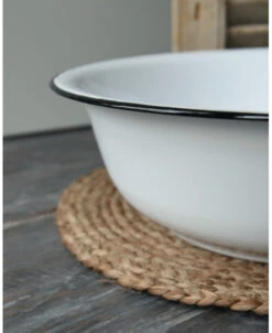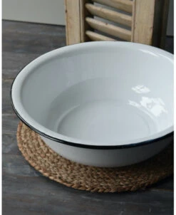 Wit emaille waskom/ schaal met zwart randje, IB Laursen. Deze leuke tijdloze schaal van emaille is wit met de kenmerkende zwarte rand. Het retro/vintage model blijft leuk en de schaal kan dan ook op heel veel manieren worden gebruikt en gedecoreerd. Zo is het leuk in de slaapkamer of het washok om hem met een handdoek en een stuk zeep te decoreren, In de keuken met fruit of gedroogde vruchten, met kruiden planten…….. Kortom een heel diverse kom/schaal die altijd erg leuk staat.