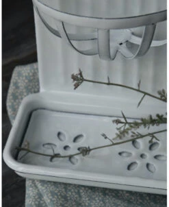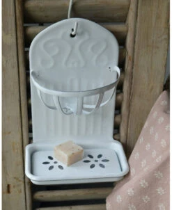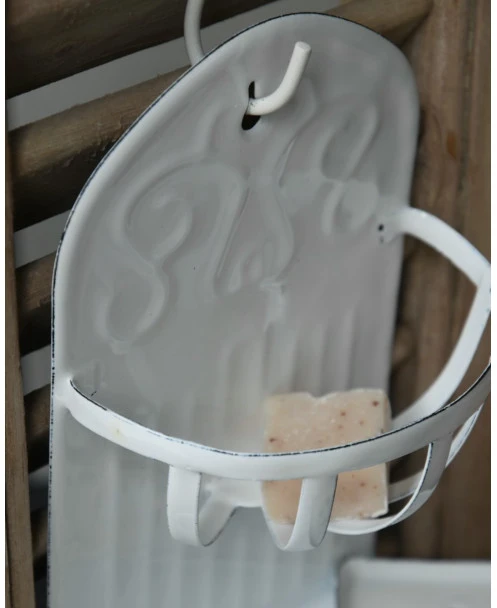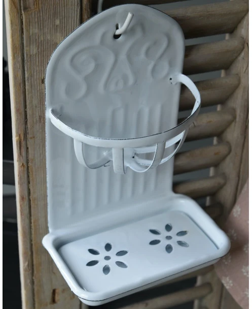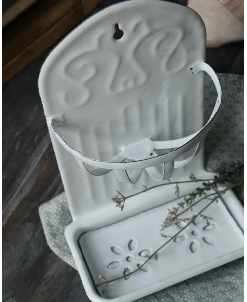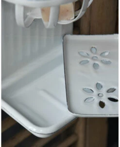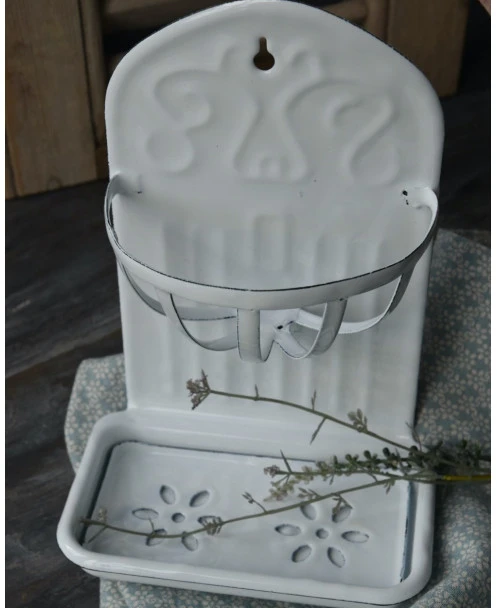 Brocante zeepbak rekje van wit emaille, IB Laursen. Dit leuke zeep rekje is gemaakt van wit emaille met aan de randen een fijn randje zwart. Het leuke model heeft een gesierde achterkant met een mooi gevormd patroon met van onder het zeepbakje met losse inzet met bloem gaatjes patroon voor het uitlekken van een gebruikt zeepje. wat hoger zit een half rond ‘mandje’ voor een sponsje, washand, nieuw zeepje of borsteltje bijvoorbeeld. U kunt dit leuke geheel gemakkelijk ophangen doormiddel van het aangegeven gat aan de muur of een rekje in de keuken, badkamer….