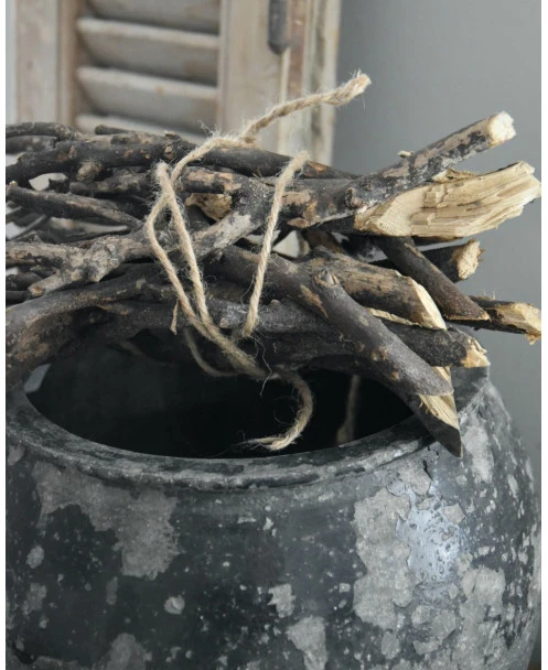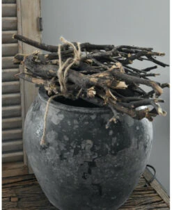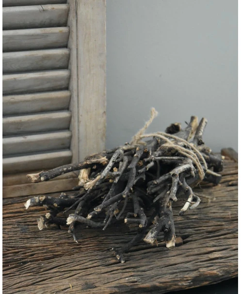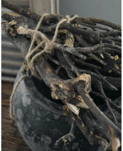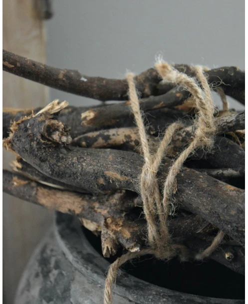 Bundel takken naturel. Deze bos takken met touw is decoratief op allerlei manieren. Zo kunt u ze op een mooie pot plaatsen, op een plateau of los in een vaas zetten met bv een seizoens gebonden sfeer. Zo kunt er in het voorjaar met eitjes en veertjes tussen verwerken en zelf losse bolletjes en mos, en rond de kerstdagen juist met wat kerstgroen en sneeuw wat lichtjes en ballen……….
