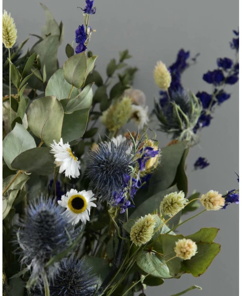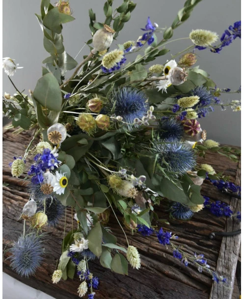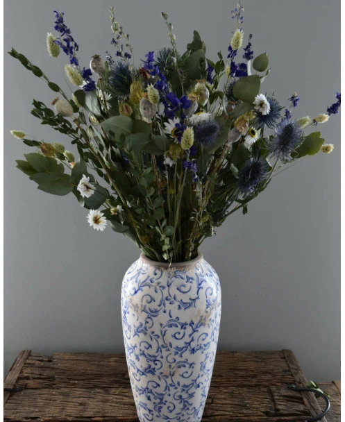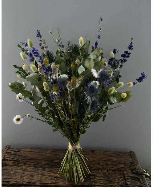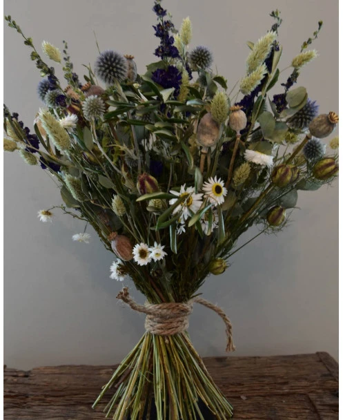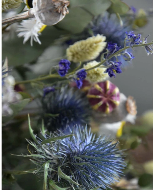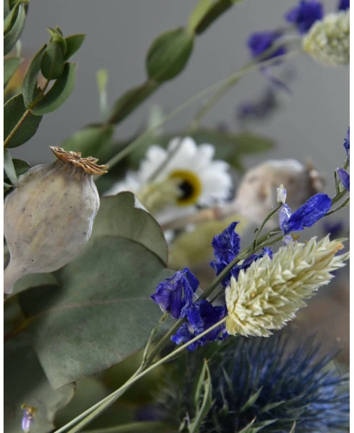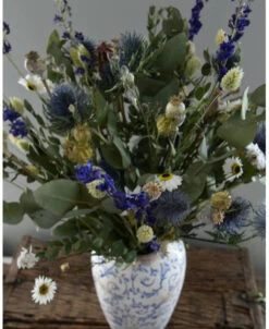 Gemengd droogbloem boeket van Delphinium, Eucalyptus, Papavers, Acroclinium, Phalaris en (tijdelijk kogeldistels) Distels. Het grote droogbloemen boeket is gemengd opgemaakt en korenschoof gebonden. Het boeket is vriendelijk in gebruik. Het heeft geen water nodig en je kunt het gedroogde boeket zo in de vaas zetten.