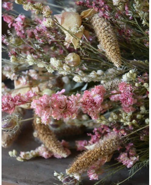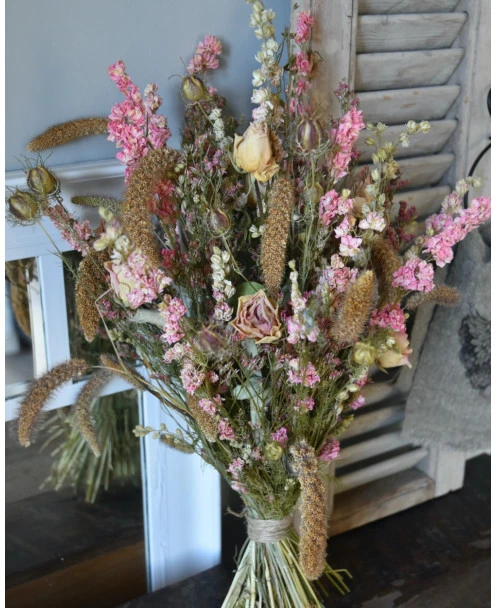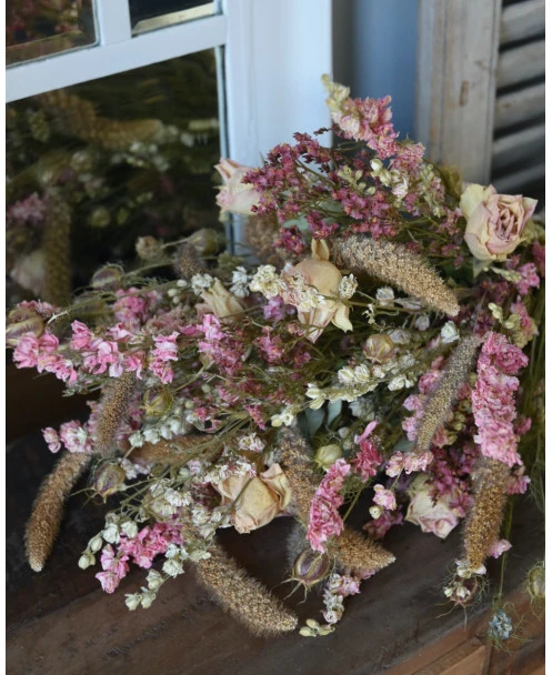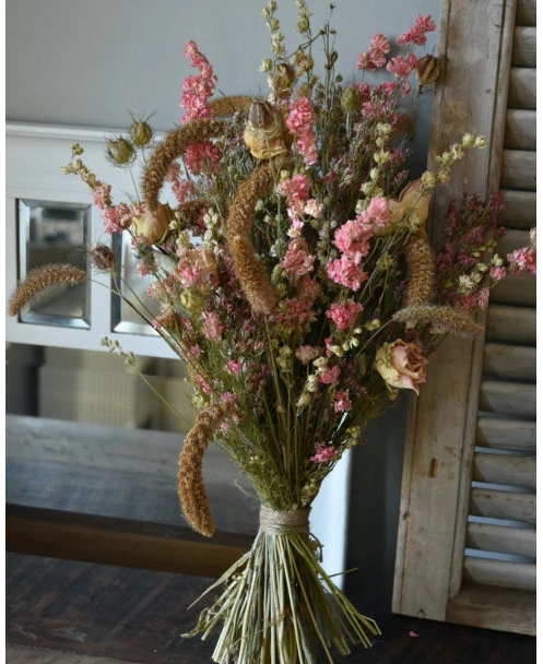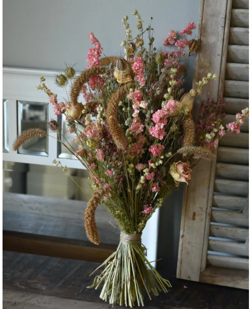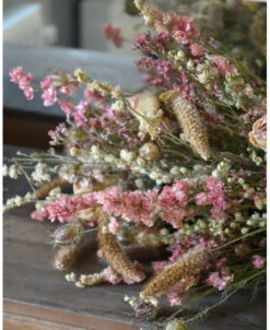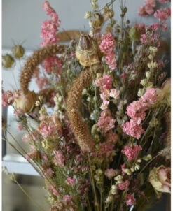 Droogbloem boeket gelaagd in naturel roze. Dit mooie boeket van droogbloemen is gelaagd korenschoof gebonden en in tinten naturel, roze, magenta en groenen. Doordat het boeket gelaagd is opgemaakt is het aan alle kanten even interessant en komen alle bloemen en pluimen mooi tot zijn recht. In het boeket zit o.a. Delphinium, Limonium, Italiaanse Setaria pluimen, Nigella en Rozen. Het boeket is met touw gebonden en u kunt het boeket zo op een mooie vaas zetten.