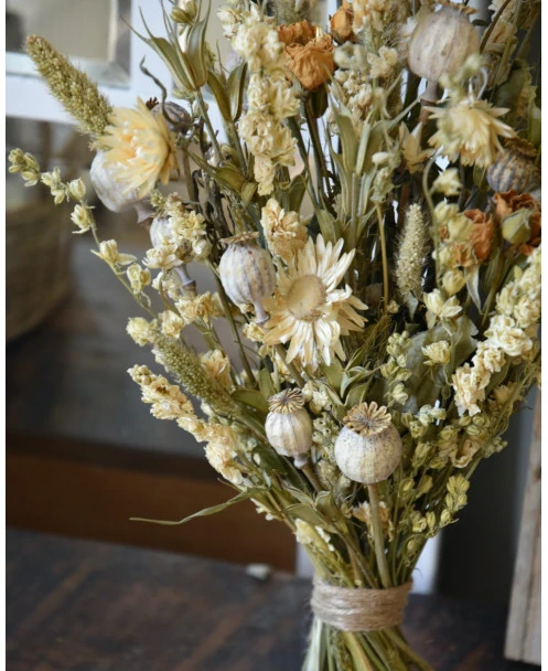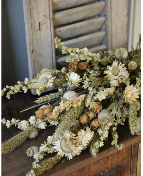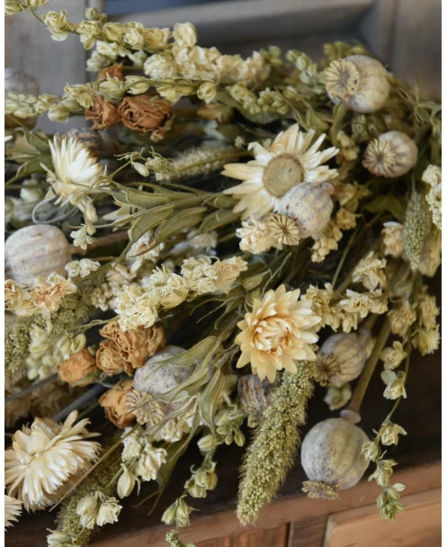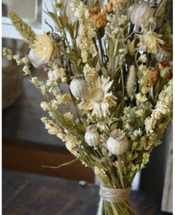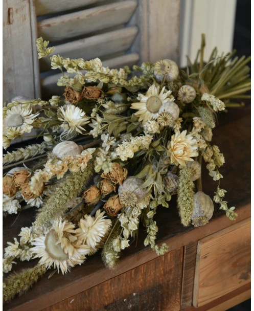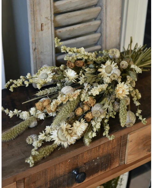 Droogbloem toef in gemengd naturel crème. Deze mooie toef met droogbloemen gemaakt is in rustige overlappende tinten naturel, groen en crème. De toef kan heel mooi in een mand worden gelegd of op de kop worden gehangen aan een kast/deur bijvoorbeeld. Ook is het erg leuk om de toef te combineren met een mooi Shabby lap die het geheel afgestemd. In de toef zit o.a. Helichrysum, Delphinium, Rosa, Papavers, Nigella sterren en Setaria.