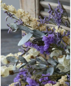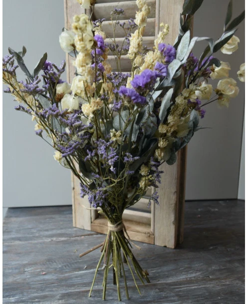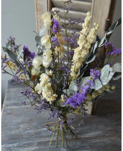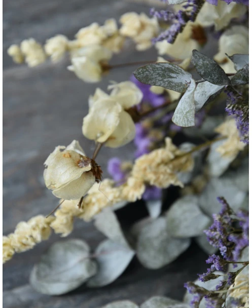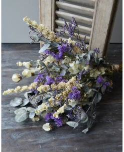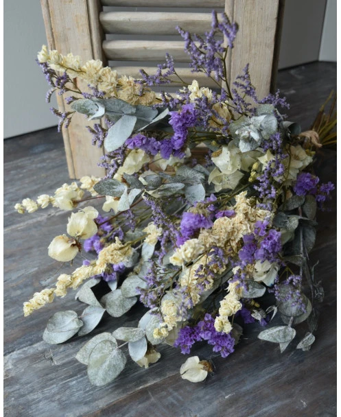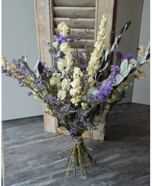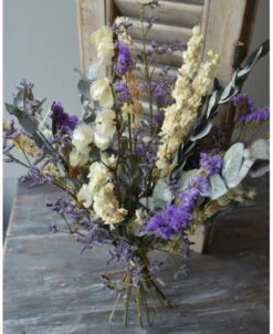 Droogbloemen boeket met o.a. Bougainvillea en Eucalyptus in het Lila, crème grijs. Dit gemengde boeket is in prachtige tinten lila, crème en grijs/groen. In het boeket zit o.a. Bougainvillea, Eucalyptus, Riddersporen, Limonium en Statice. U kunt het boeket zo in een vaas of pot zetten. Het boeket is zo bijzonder door de gebruikte gedroogde bloemen zoals de Bougainvillea en de prachtige lila tinten van de Limonium en de Statice.