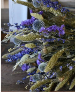 Droogbloemen veldboeket in gemengde groen en blauw tinten. Dit mooie veldboeket van droogbloemen is opgemaakt in groen/blauwe tinten. In het boeket zit o.a. Kogeldistels, Delphinium, Phalaris, Statice, Haver, Setaria en Nigella. Het boeket is korenschoof gebonden met touw en gemengd opgemaakt. U kunt het zo in een mooie vaas of pot zitten en van het geheel genieten.