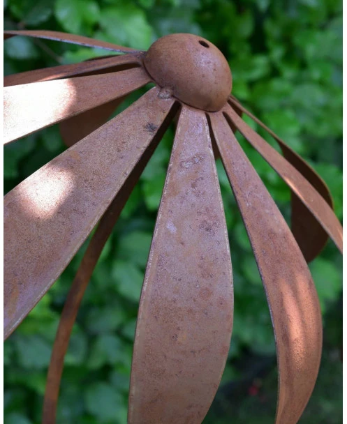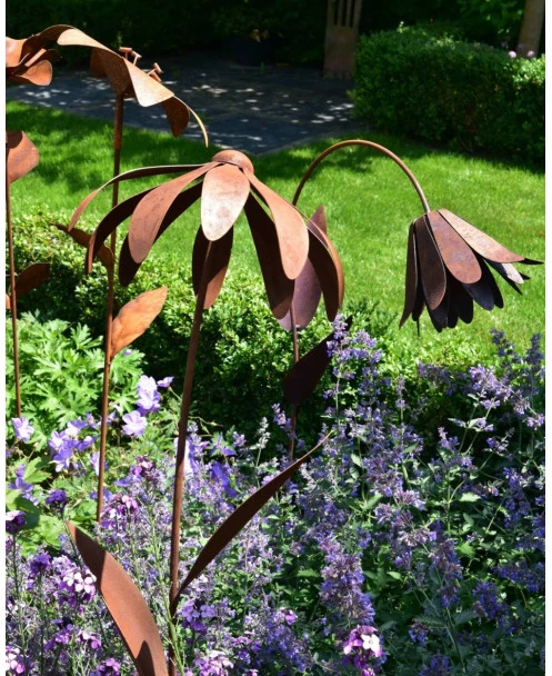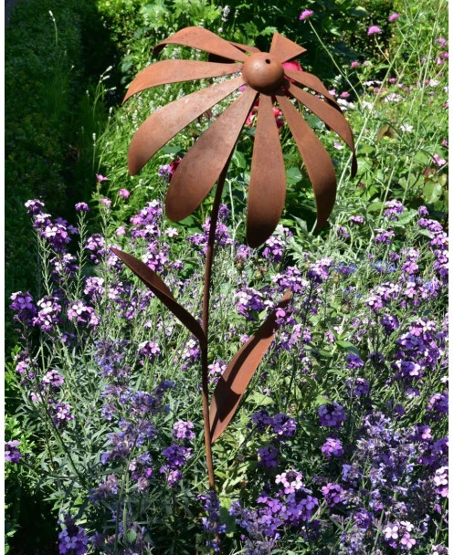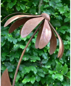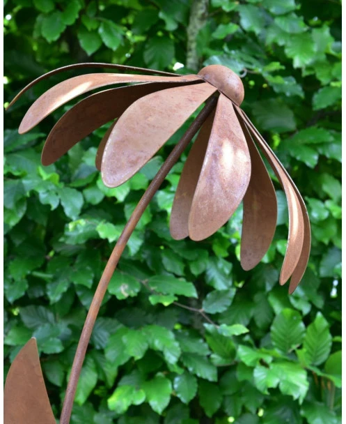 Echinacea tuinsteker van metaal dat door behandeling een roestlaag heeft gekregen. Deze sierlijke bloem van de Echinacea ofwel de Zonnehoed waarbij de bloemblaadjes wat naar beneden staan en de zo ook aan zijn naam te herkennen is. De licht gebogen bloemsteel heeft ook prachtige bladeren en de bloem zelf is de eerste keer voorzichtig in het juiste model te buigen. Door de wind wiegen de tuinprikkers en in alle seizoenen is het een aanwinst in de tuin.