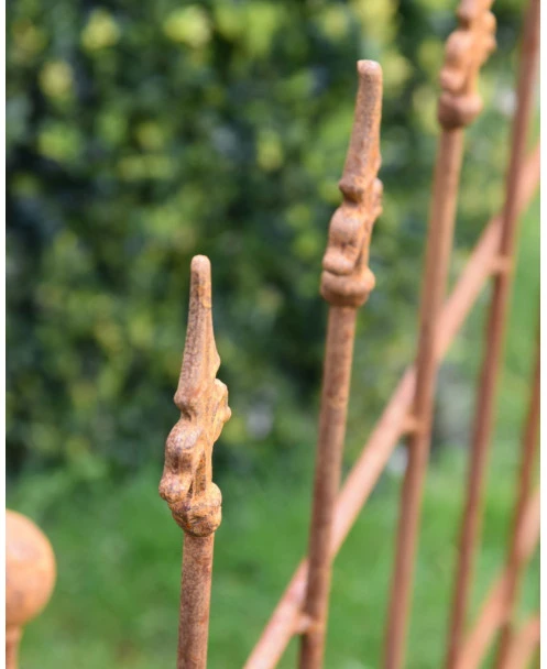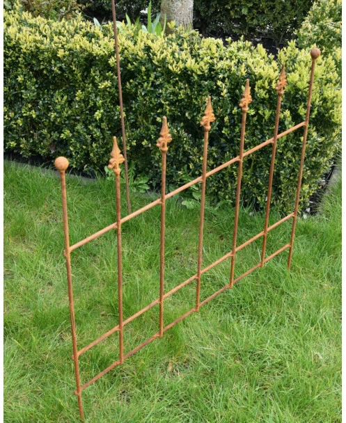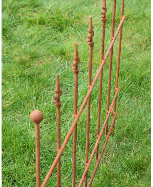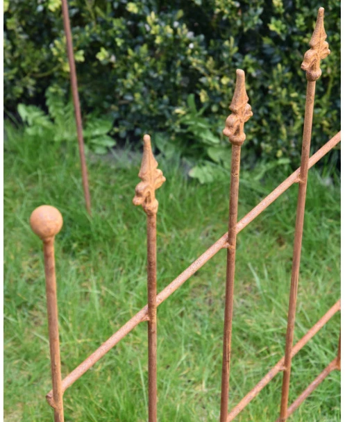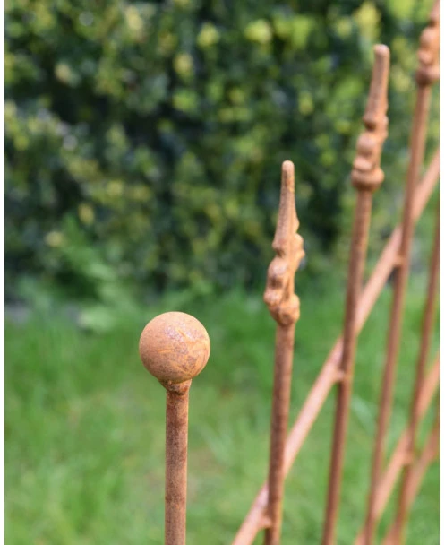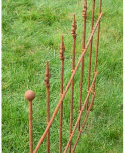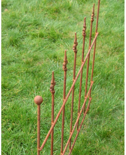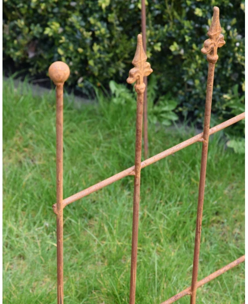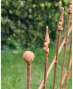Ecoroest hekje met Franse Lelie punten. Dit hekje van ecoroest heeft sierlijke Franse lelies als punten en de buitenste stijlen hebben een ronde punt. Het hekje heeft 7 stijlen en kan met de buitenste stijl zo in de grond worden gezet. Zo kunt u een kleine afzetting maken of het hekje bv in de tuin plaatsen om een plant te ondersteunen.