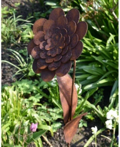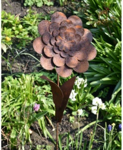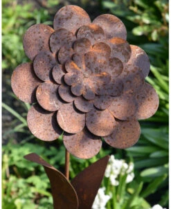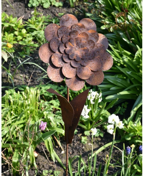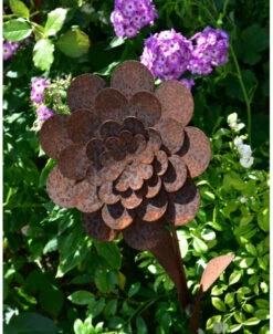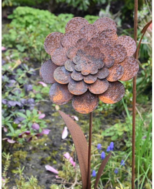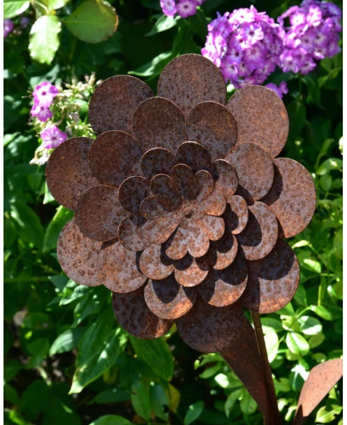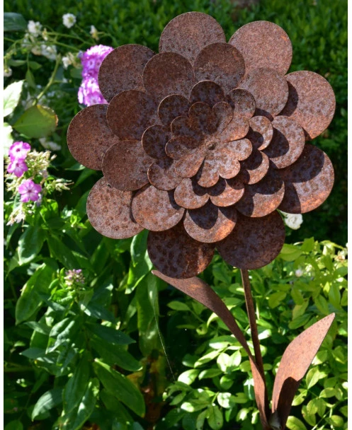 Ecoroest tuinprikker Dahlia. Deze mooie gevilde bloem van de Dahlia heeft ronde blaadjes die naar binnen toe steeds compacter worden. De ecoroest tuinprikker staat op een lange steel met bladeren die zo in de tuin tussen de beplanting kan worden gezet. De Dahlia kan ook heel mooi worden gecombineerd met andere ecoroest bloemen waar u het gehele jaar van kunt genieten in de tuin.