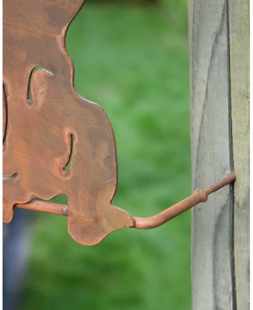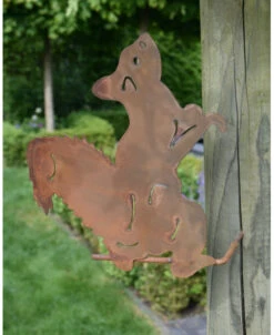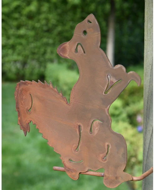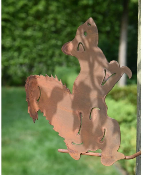 Eekhoorn zittend op stok ecoroest tuindecoratie. Deze leuke Eekhoorn met een mooie volle staart zit op een stokje/takje om zo naar boven te kijken/springen. De tuindecoratie is van ecoroest gemaakt die door een speciale behandeling een mooie roestlaag heeft gekregen. Aan de 3D stok (die om de hoek gaat, voor een mooi effect) zit een schroefeind zodat u de Eekhoorn gemakkelijk in een boompaal of schutting kan worden geschroefd. (wel even voorboren) U kunt zo lang genieten van dit silhouet in uw tuin…