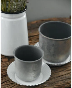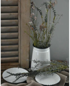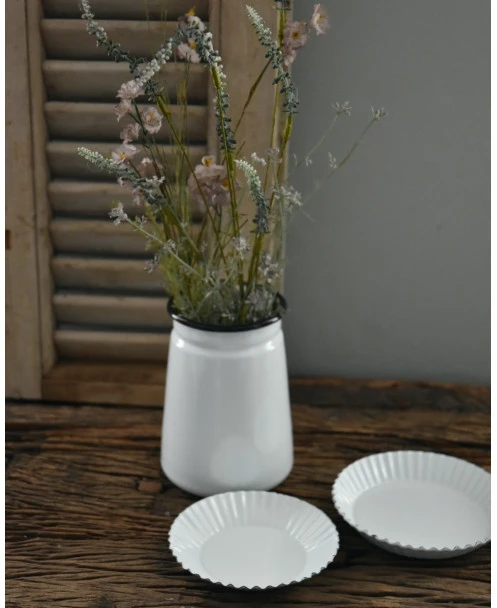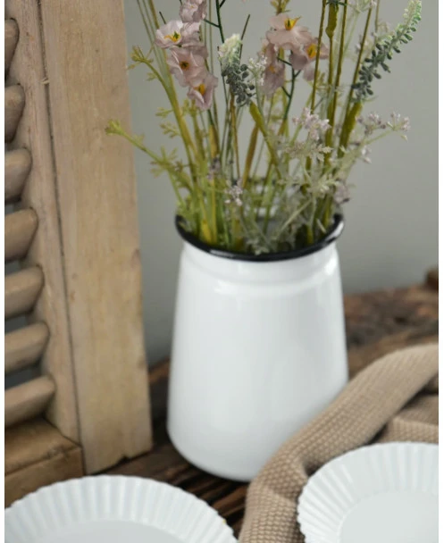 Emaille vaas, IB Laursen per stuk. Deze leuk pot/vaas is van een mooie zware kwaliteit emaille gemaakt. De pot is wit met een zwart randje aan de bovenkant. De vaas loopt iets taps naar binnen en heeft net onder de rand een verdiepte rand. U kunt de pot bv als vaas gebruiken met (droog)bloemen of zoals op de foto met kunst takken van IB Laursen.