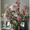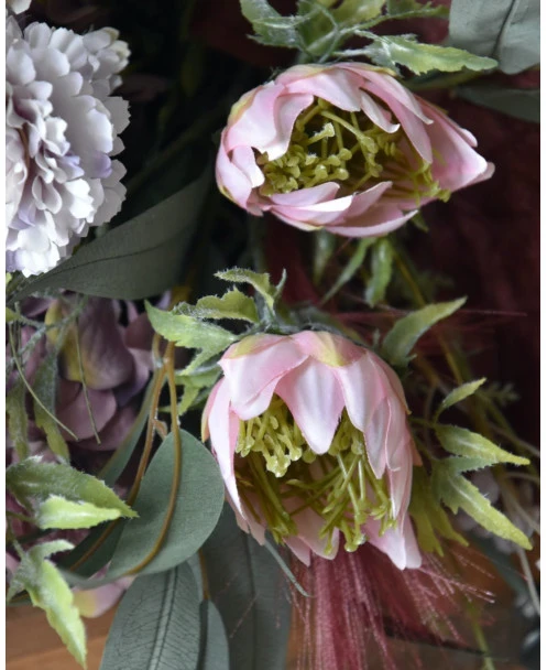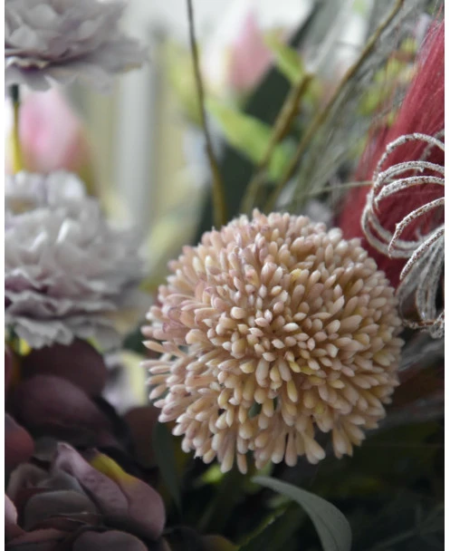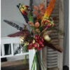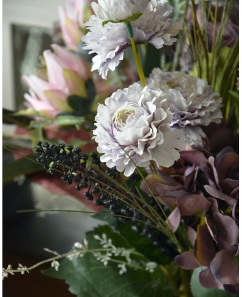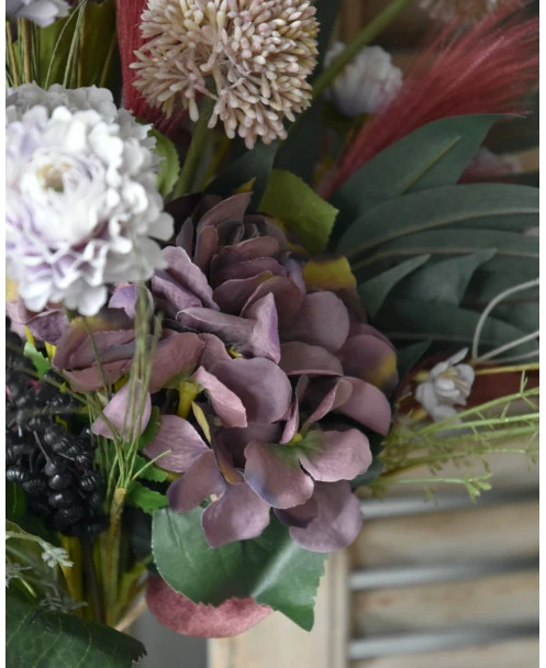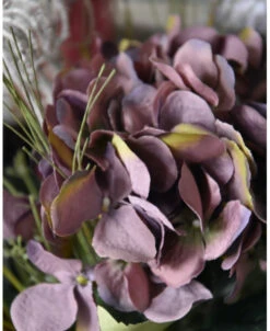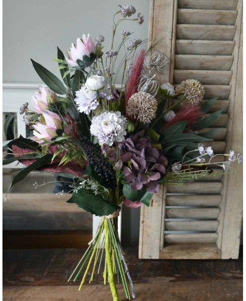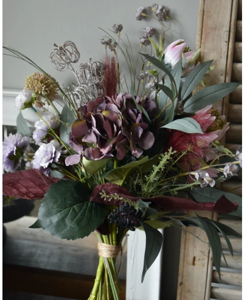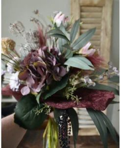 Engels zijde plukboeket in lila violet tinten. Dit prachtige boeket van zijde/kunst bloemen is in mooie warme tinten lila, violet, paars, oud roze en grijs/groen. De kleuren complimenteren elkaar en ook de bloemen versterken elkaar in dit Engelse plukboeket. In het boeket zitten o.a. Hortensia’s, Protea’s, Eucalyptus, Clematis, Allium, dubbele Asters, Karmozijn bessen en verschillende groen soortjes waaronder twee mooie grote velvet bordeaux bladeren. U kunt het boeket zo op een mooie pot of vaas zetten en heel lang genieten van deze prachtige creatie. Ook is het altijd een mooi cadeau om iemand blij mee te maken…