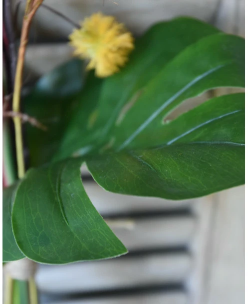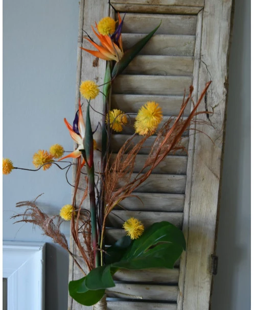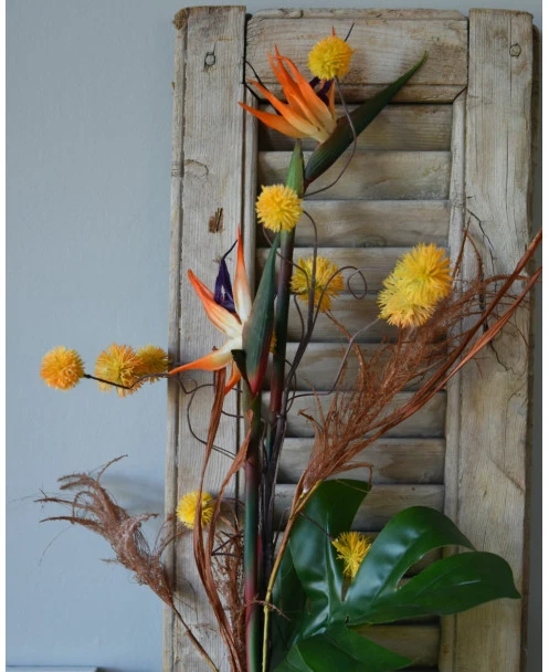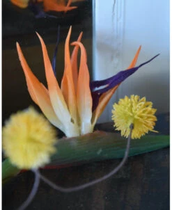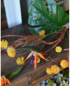Fles boeket met real touch Strelitzia’s, Paradijsvogelbloem. Dit mooie ranke flesboeket is in mooie tinten groen, oranje, rood/bruin en geel/oranje met als hoofdbloem de Strelitzia ofwel de Paradijsvogelbloem. Het zijde/kunst boeket past gemakkelijk in een mooie grote fles vaas en al de bloemen zijn goed zichtbaar, komen mooi tot zijn recht en vormen samen een passend geheel. In het boeket zitten twee real touch Strelitzia’s een Monstera blad, Hamamelis balletjes en gras pluimen. Het boeket is gebonden met touw waardoor het zo in een vaas gezet kan worden.