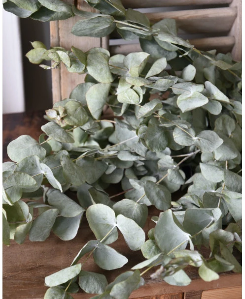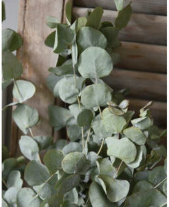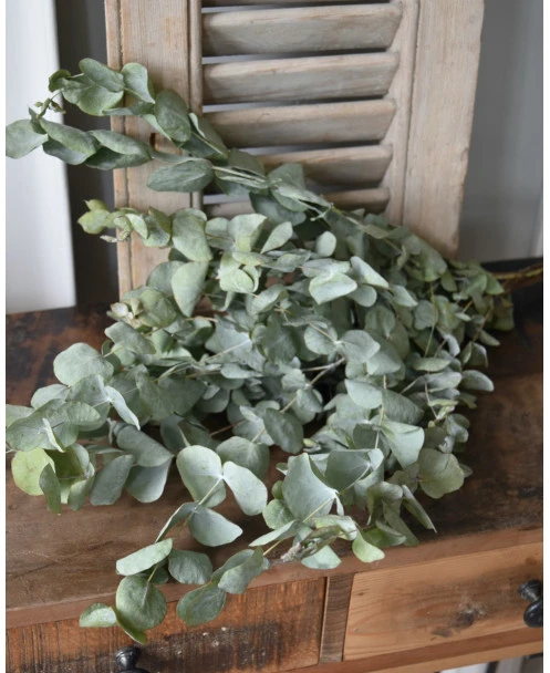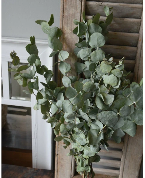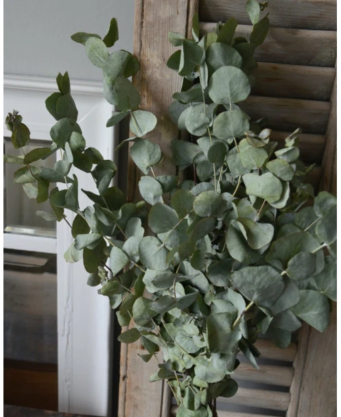 Gedroogde Eucalyptus Cinerea. Deze gedroogde Eucalyptus heeft het typerende grijs groenige ronde blad. Ook de geur van Eucalyptus is heel specifiek voor deze takken. De eucalyptus staat mooi in een pot of oude leemmand met eventueel een dik touw of toefhanger. Ook is het een mooi blad om met bv tijm samen te binden tof toef en op de kop aan een deur of muur te hangen.