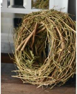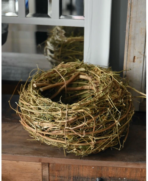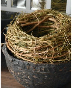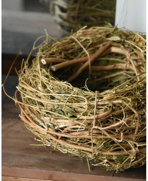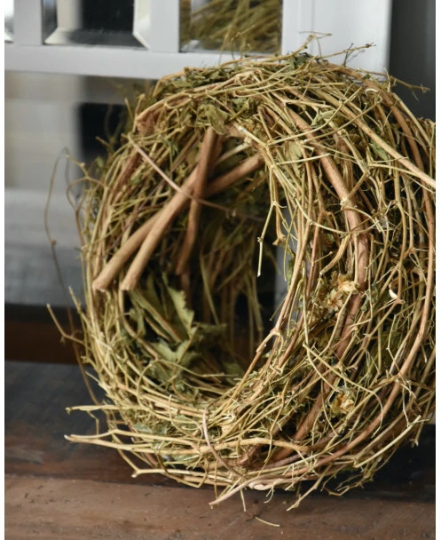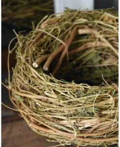 Gedroogde Hop krans groot. Deze krans is gemaakt van de ranken van Hop die zijn opgedraaid tot een krans. De krans is goed gevuld en staat mooi op een grote pot, plateau/schaal of aan de muur. De krans is ook leuk te decoreren met eitjes, vogeltjes en veertjes. Doordat de krans van natuurmateriaal is kan de tint en en model iets afwijken.