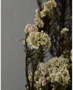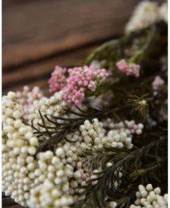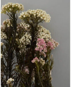 Gedroogde Rice Flower. Deze prachtige bijzondere Ozothamnus bloemen heten dan ook rijst bloemen omdat de bloementjes net korreltjes rijst lijken. Het zijn trossen witte en soms roze bloemetjes die aan takken zitten waar prachtig donkergroen fijn (naald) blad aan zit. De Rijstbloemen zijn gepreserveerd waardoor ze zo mooi van kleur zijn.