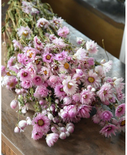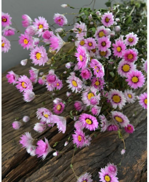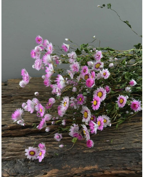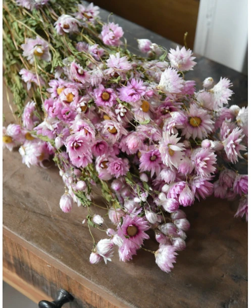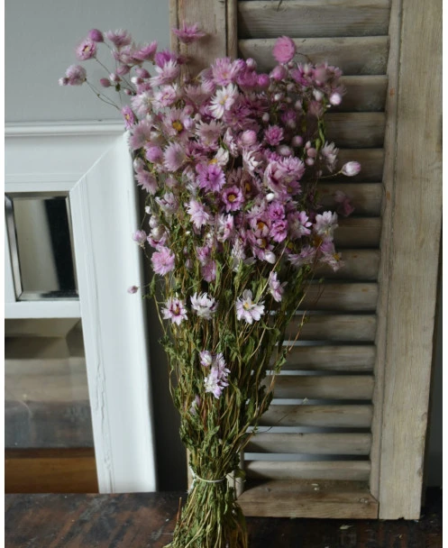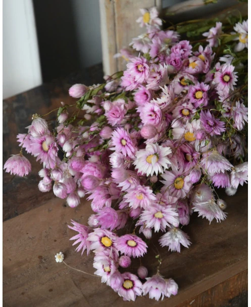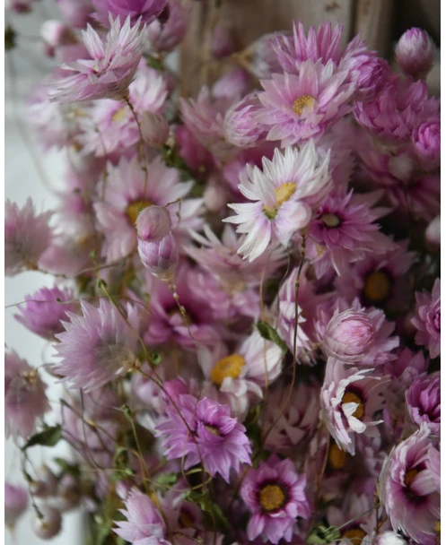 Gedroogde roze Rhodanthe. Deze vrolijke Rhodanthe bloemetjes zijn gedroogd en in een Ton sur Ton roze kleuren pallet. De Rodanthe kan heel goed worden gemengd in een boeket, maar is ook heel mooi solide in een vaas of kleine vaasjes. De tint van de Rhodanthe kan onderling verschillen van roze naar licht poeder roze per bos.