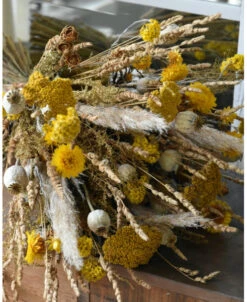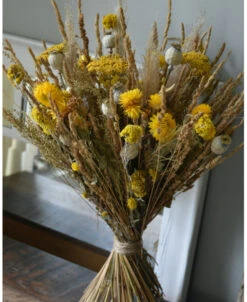 Gemengd droogbloemen boeket gelaagd in naturel geel. Dit mooie rustige boeket is van droogbloemen gemaakt die in mooie naturellen en gelen zijn samengesteld. Het boeket is iets gelaagd waardoor het wat spannender is en er mooie dieptes in ontstaan. Het boeket is opgebonden met een jute touw en kan zo in een mooie vaas/pot worden gezet. In het boeket zit o.a. Kropaar, Helichrysum, Sanfordii, Papavers, Achillea, Pampus pluimen, Solidago en tros Roosjes.