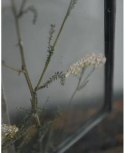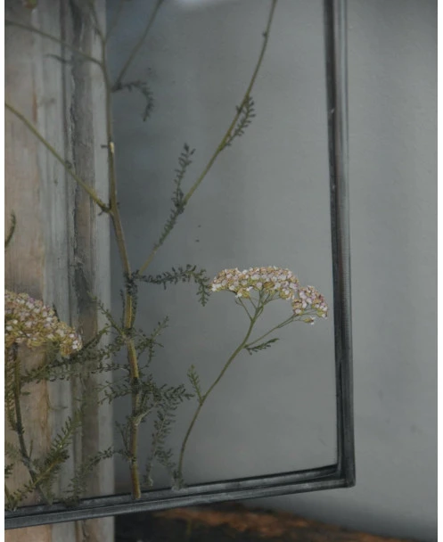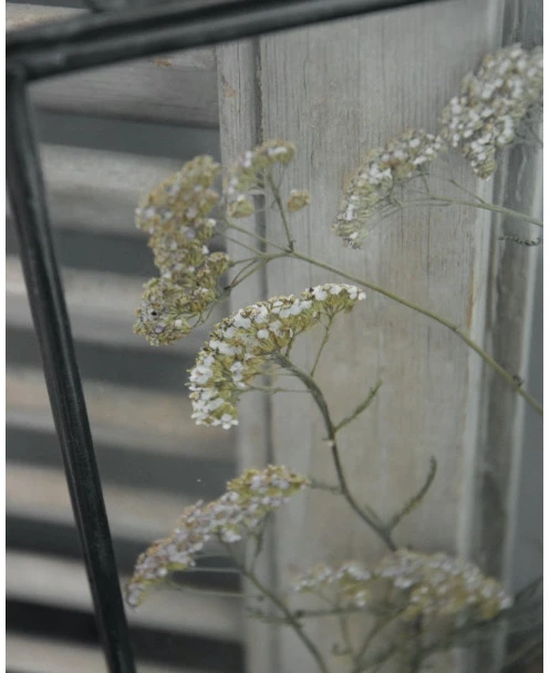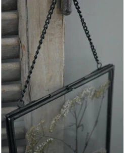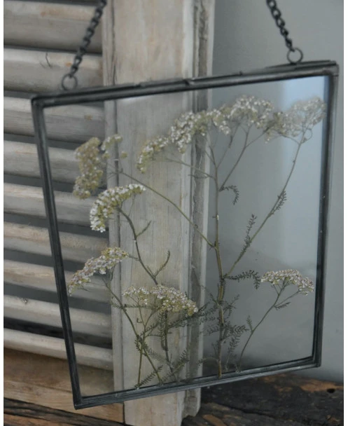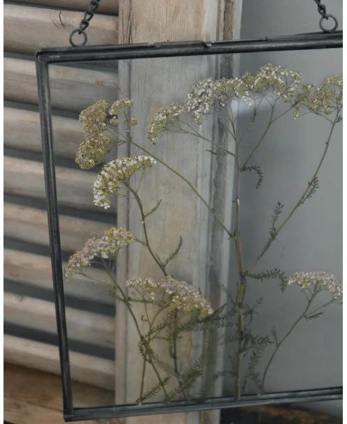 Geperste Schermbloemen in een lijst met kettinkje. Deze prachtige geperste Schermbloemen hebben een prachtige lichte kleur. De grote lijst is gevuld met geperste Schermbloemen in bloei en in de knop met wat blad. De lijst is van metaal met glas waar een kettinkje aan zit om de lijst mee op te hangen.