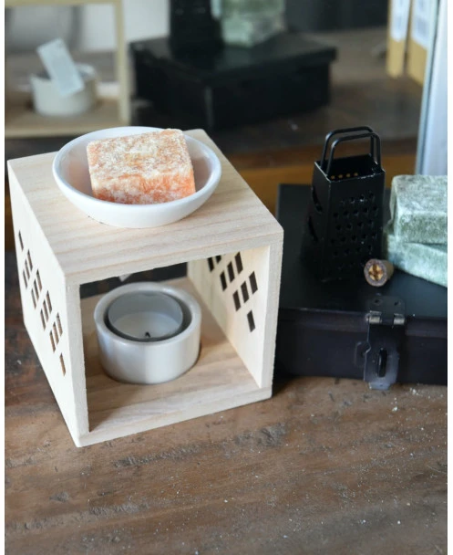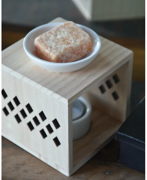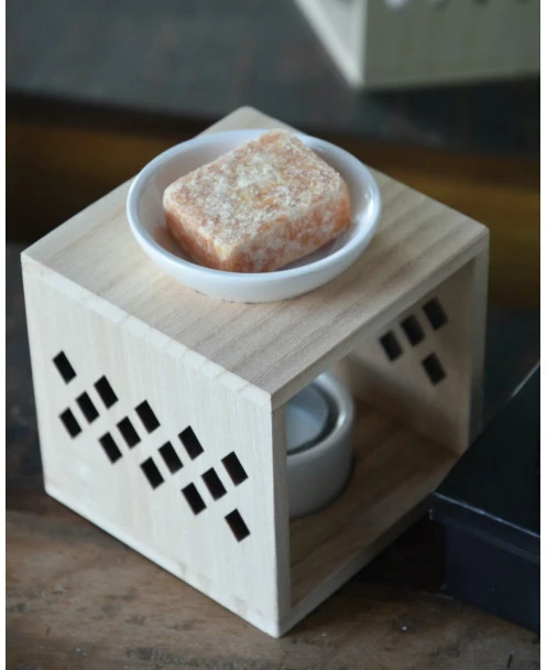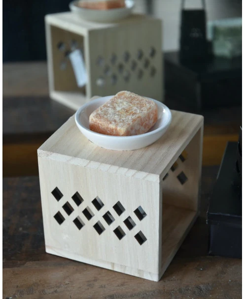 Geur brander hout met keramiek schaaltjes. Deze leuke geurbrander is in een kubus model en van naturel hout gemaakt met twee keramiek schaaltjes voor het waxinelichtje en voor een amber blokje. Aan de zijkanten van de brander zit een ruitvormige gaten patroon voor een sfeervol licht, wanneer er een amber blokje (of een stukje ervan) in het bovenste schaaltje wordt gelegd en gesmolten ontstaat er een heerlijke geur die nog intenser is. De brander is exclusief Amber blokje en waxinelichtje.