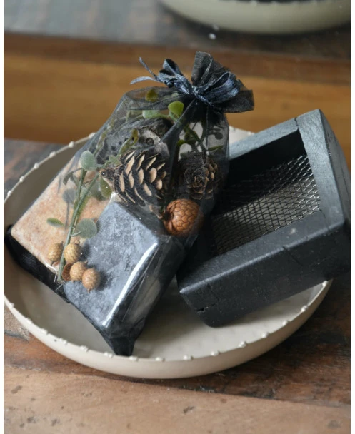 De Amber blokjes zitten per stuk in folie verpakt en zo samen met alle decoratie in het organza zakje, de rasp en het schaaltje zitten los (zie foto 2,4,6,8)