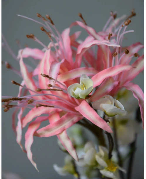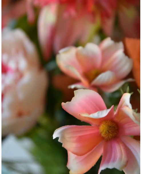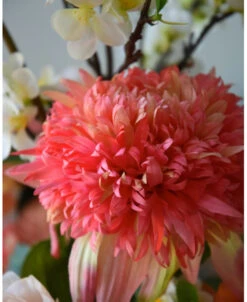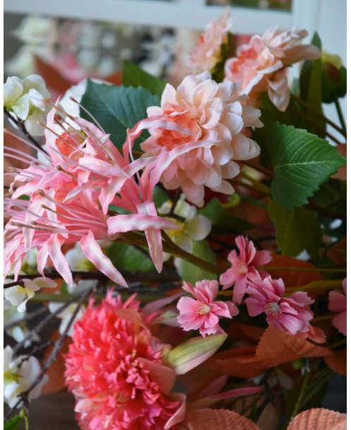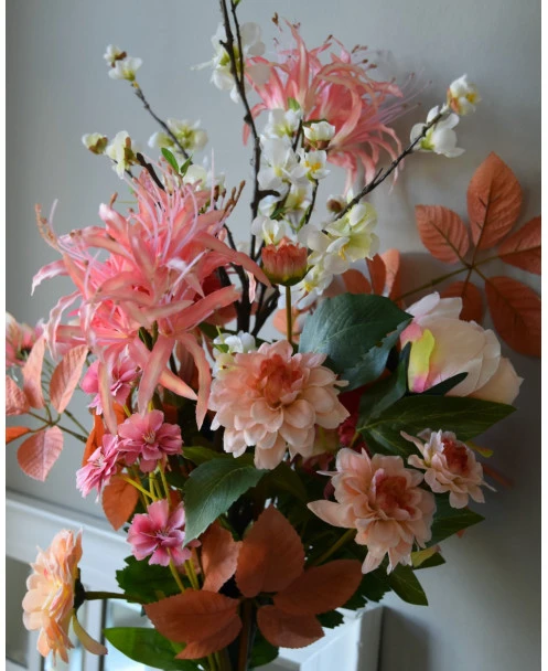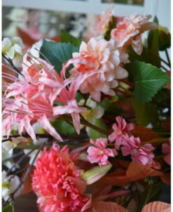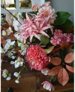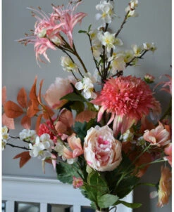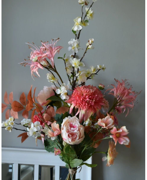 Gevuld zijde plukboeket in perzik roze tinten. Dit prachtige boeket voor met de mooiste bloemen in verschillende perzik roze tinten in van zijde/kunst bloemen. Het boeket bestaat o.a. uit Kersenbloesem, Papaver, Mimosa, Pioenrozen, Dianthus, blad, Zinnia’s, Haaklelie en Dahlia’s. U kunt het boeket op een mooie grote vaas zetten en heel lang genieten van dit geheel. De bloemen zijn vrij lang en kunnen altijd op maat worden geknipt met een tang of door bv de onderkant van de steel te buigen. Het kan zijn dat wij voor vervoer de onderkant van de steel buigen.