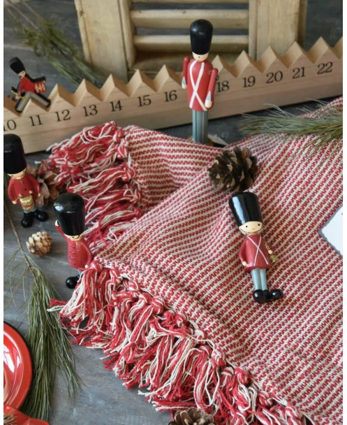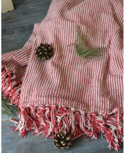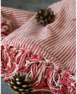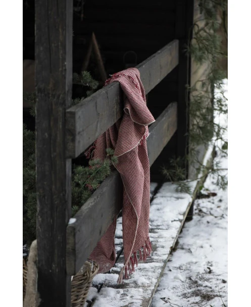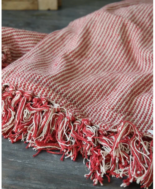 Geweven woonkleed/ sprei gebroken wit met fijne rode strepen, IB Laursen. Dit leuke woonkleed ofwel sprei heeft een mooi geweven patroon van strepen in het rood en gebroken wit met kwastjes aan de boven en onderkant. Het kleed geeft een mooie rijke kleur en sfeer in uw woning over een bank of stoel, in een grote mand gedrapeerd of buiten over een stoel. Ook is het een leuk kleed om over het uiteinde van een bed te draperen. De rode kleed kan eigenlijk het gehele jaar worden gebruikt.