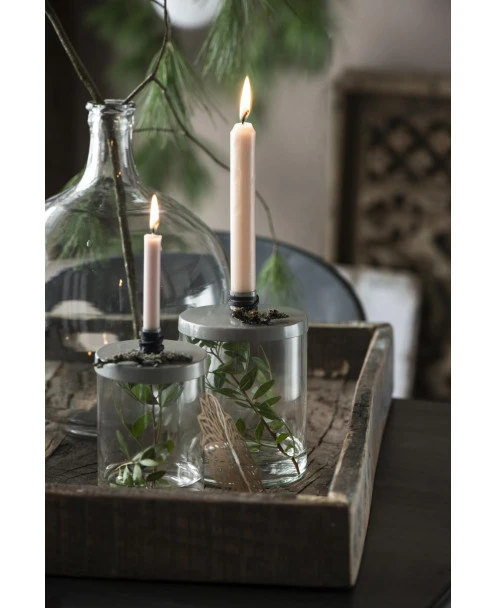 Glazen pot met grijs metalen kaarsen inzet, IB Laursen. Deze leuke kandelaar voorraad pot van glas met grijs metalen deksel waar een kaarseninzet op zit kan op heel veel leuke manieren worden gedecoreerd. Natuurlijk is het mogelijk om de pot te vullen met een voorraad korte kaarsen in alle gewenste kleuren, het is ook leuk om er wat dennenappels met wat groen, kerstballen, schelpen, of droogbloemen in te doen om zo altijd een originele kandelaar in huis te hebben. In de kaarsen inzet past een normaal formaat tafelkaars (a2,2 cm).