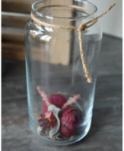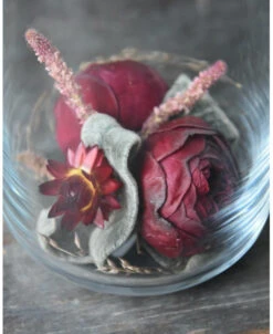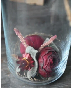 Glazen vazen gevuld met gevriesdroogde bloemen in het bordeaux rood. Deze glazen cilinder vaas is gevuld met een droogbloem/gevriesdroogd stukje. De prachtige diep rode tuinrozen zijn gevriesdroogd, het stukje is een geheel met mooi blad Helichrysum, Statice en Panicum die door de rondte is gedraaid. Aan de bovenzijde van het glas zit een jute touw. U kunt het stukje zo neerzetten of cadeau geven.