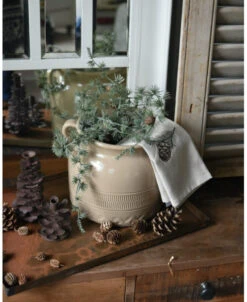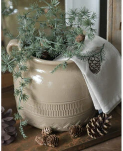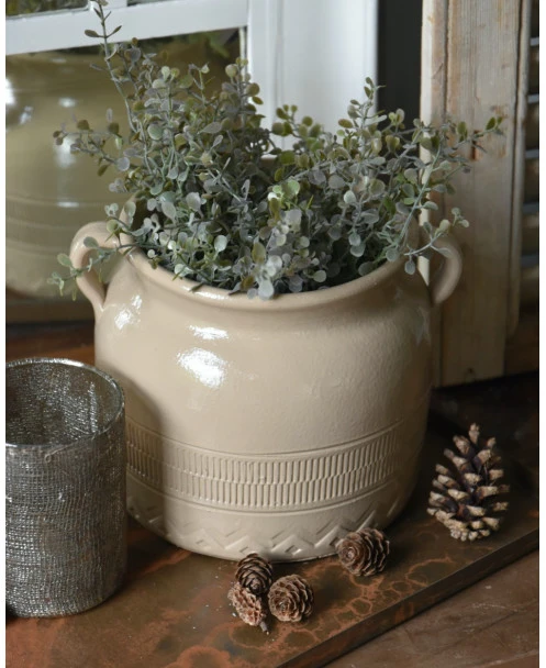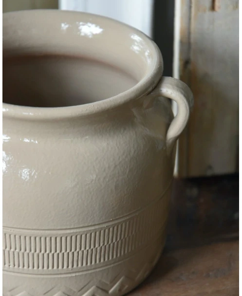 Gres pot met patroon in onderrand en oren, IB Laursen. Deze prachtige handgemaakte pot heeft een mooie klei kleur een beetje een linnen tint. De pot is van hoge kwaliteit en heeft een prachtige gewerkte onderrand met een patroon met een klein ruitje, een zigzag en een twee verticale randen. De pot heeft twee kleine oren en een brede kraag. De pot is mooi afgewerkt en iets glanzen. Een nieuwe pot in een ‘oude’ tijdloze look.