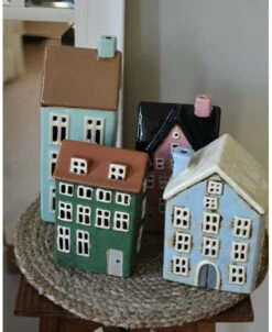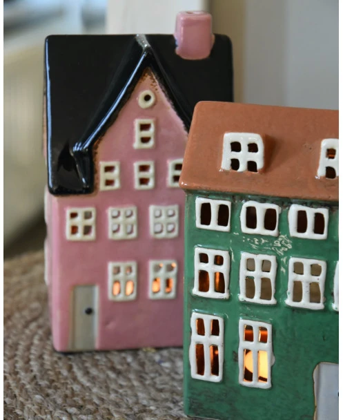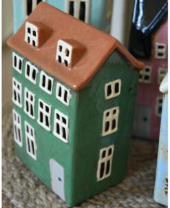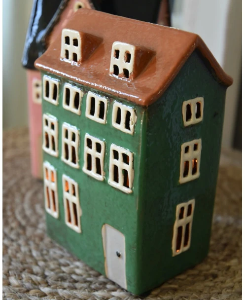 Groen pakhuis Nyhavn theelicht met lichte ramen en dakkapellen, IB Laursen. Dit leuke theelicht huis geïnspireerd uit de Deense plaats Nyhavn met al zijn kleurrijke pakhuizen, is in het groen met lichte open ramen, grijze deur, rood/bruine dak en twee dakkapellen. U kunt via de achterkant een waxinelichtje in het huisje plaatsen zodat alle ramen een mooi schijnsel geven. Het pakhuis is van keramiek gemaakt en met de hand beschilderd met een iets geleefde look, waardoor de huisjes heel sfeervol zijn. U kunt naar wens bv een leuke opstelling maken met de ander huisjes.