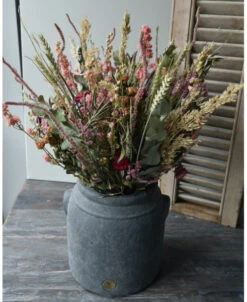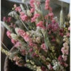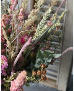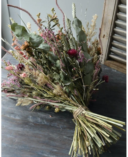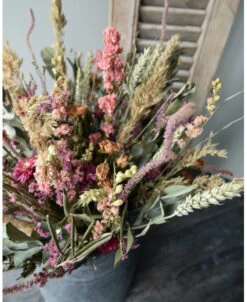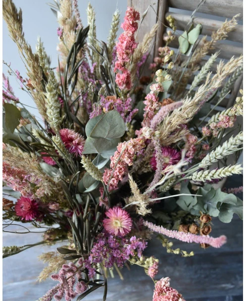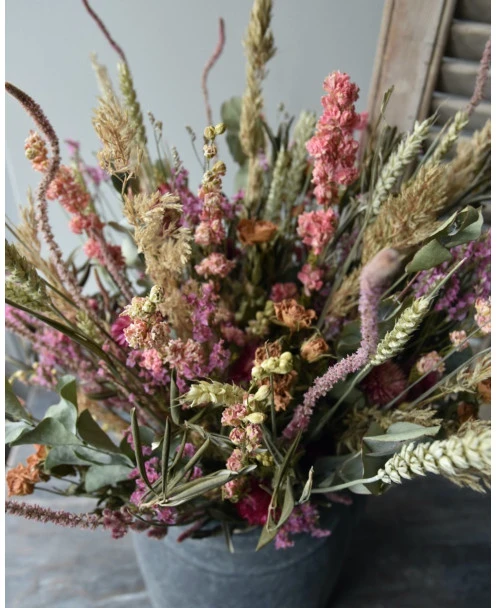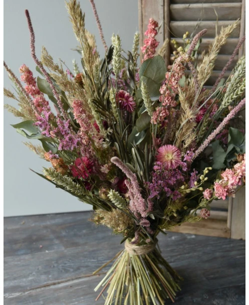 Groot gelaagd droogbloem boeket in roze, violet en groen. Dit extra grote boeket gemaakt met heel veel gemengde droogbloemen in lagen gerangschikt. De tinten van het boeket zijn verschillende tinten roze en violet samen met groenen. Het boeket is samengesteld met o.a. bloeiend Alfonso gras, Staart Statice, Limonium, Helichrysum, Eucalyptus, Olijfblad, Delphinium en Tarwe die gelaagd in het boeket zijn gemengd waardoor er een mooi diepte effect ontstaat. Het boeket is gebonden met touw en kan daarom zo op een mooie pot of vaas worden gezet.
