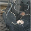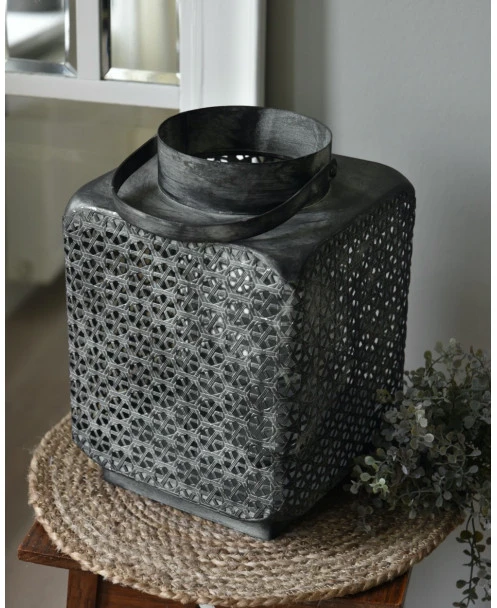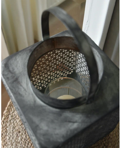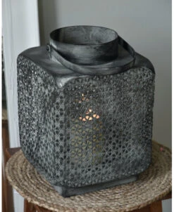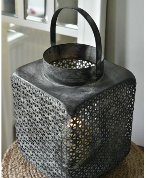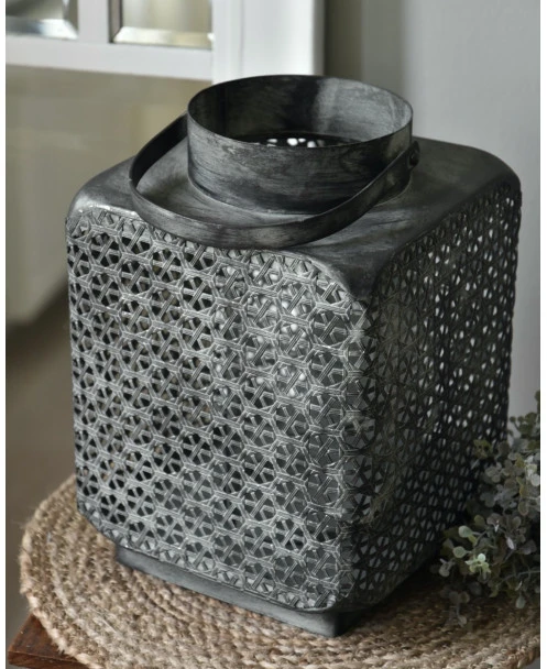 Groot metalen windlicht met weefpatroon en hengsel, vierkant. Dit mooie grote windlicht is van metaal met een mooi soort weefpatroon waartussen open gaatjes zitten waardoor het schijnsel van de kaars een mooi effect geeft. Het model is vierkant met van boven een ronde opening met hengsel. In het windlicht zit een houder waarin een cilinderglas staat waardoor de kaars minder last heeft van wind en mooi blijft branden. Het metaal heeft een ietwat donkere afwerking met lichtere poederachtige accenten die het patroon benadrukken en zo het geheel tot een prachtige groot windlicht maakt.