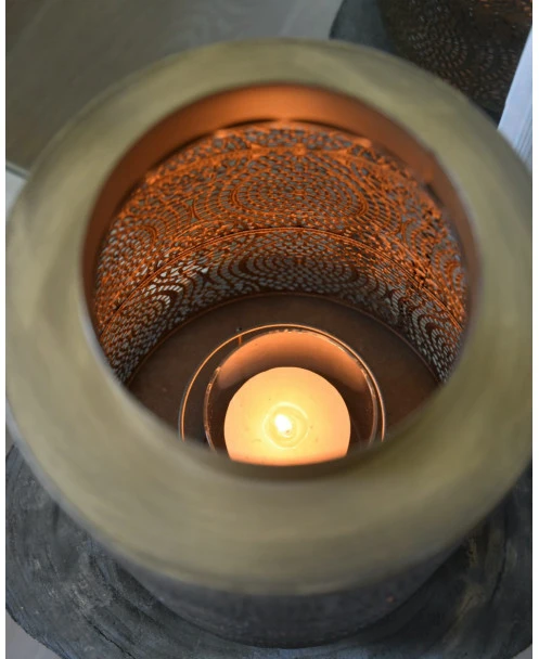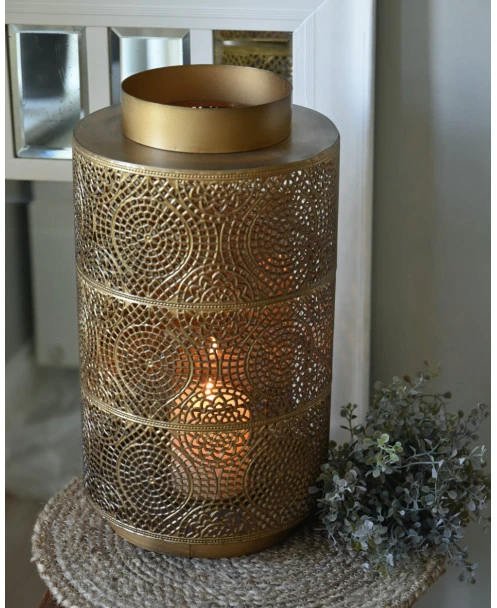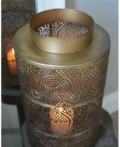 Groot windlicht met sfeervol gaatjes patroon antiek-look messing. Dit grote hoge windlicht is van metaal gemaakt en heeft een antiek-look messing afwerking. Het windlicht is rond als een recht opgaand model waar een sierlijk patroon met gaatjes waardoor het licht een mooi schijnsel geeft. In het windlicht zit een houder en een glas waarin er veilig een kaars gebrand kan worden.