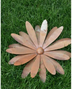 Grote bloem ecoroest in 3D als ‘wand’ tuindecoratie. Deze prachtige bloem met veel bloemblaadjes en hart is van ecoroest gemaakt, u kunt de bloem bv aan de schutting of het schuurtje hangen om zo van deze decoratie te genieten. Het metaal heeft een speciale behandeling gekregen waardoor hij een mooie roestlaag heeeft gekregen. aan de achterzijde zit een rond lipje waaraan u de bloem gemakkelijk kunt ophangen.