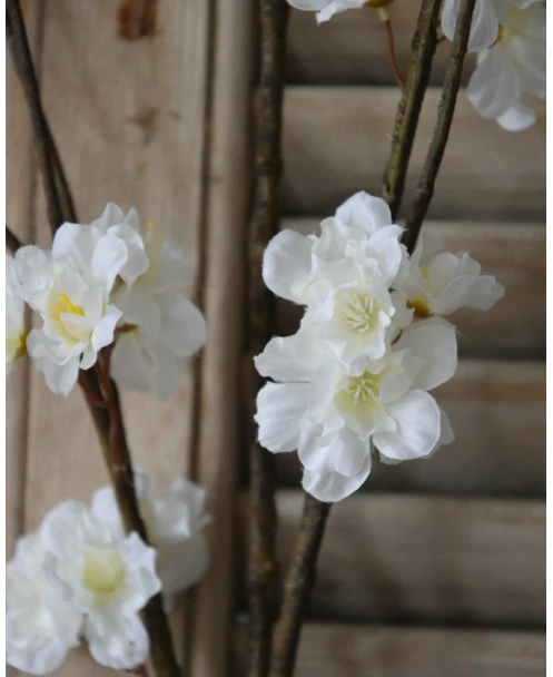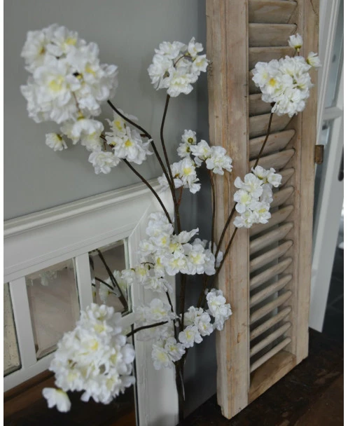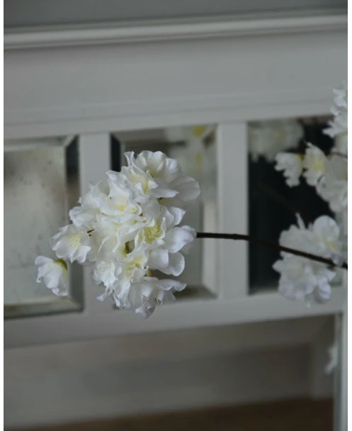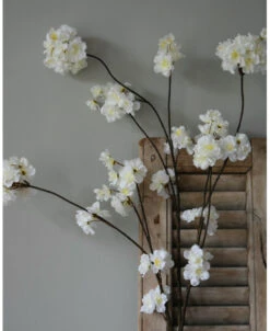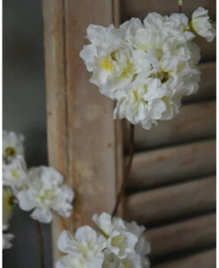 Grote bloesem tak met weelderige witte trossen bloemen. Deze prachtige grote bloesem tak is mooi vertakt en heeft heel veel trossen met witte bloesem bloemen. De tak valt al erg mooi door alle vertakkingen en kan nog naar wens iets in de voor u juiste positie worden gebogen. U kunt de tak op een mooi hoge fles/vaas of kruik bijvoorbeeld zetten en er zo heel lang van genieten. Doordat de bloesemtak zo lang is kan het zijn dat wij in het onderste gedeelte de tak gebogen versturen.