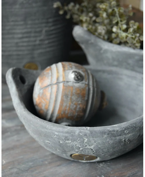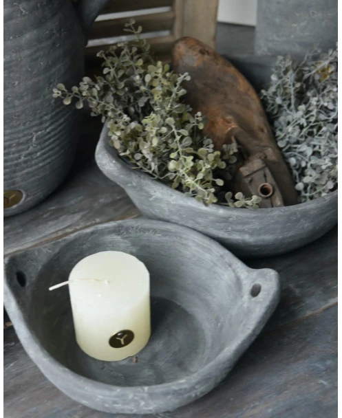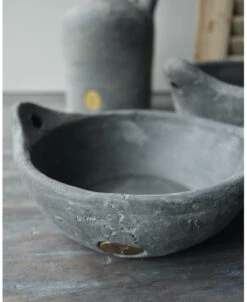 Handgemaakte diepe schaal met twee oortjes klein, Vintage Brynxz. Deze mooie schaal heeft een iets bolle vorm met aan de bovenkant twee oortjes die mooi doorlopen in ‘punten met een rond gat. De aardewerk schaal is handgemaakt en heeft een Vintage afwerking waardoor er een mooi karakter ontstaan. Aan de voorzijde zit het Brynxz logo verwerkt. De schaal is ook in een groter formaat verkrijgbaar (zolang de voorraad strekt). U kunt de schaal op talloze manieren gebruiken en decoreren, als fruitschaal, met bolletjes, vetplanten, planten van Brynxz en een mooi ornament….. De schaal is niet 100% waterdicht, we adviseren om altijd een binnenschaal of plastic te gebruiken wanneer u er levende planten in zet.