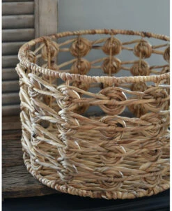 Handgemaakte mand met cirkel patroon, groot per stuk. Deze prachtige mand is in een rond model met patroon van cirkels/rozen die de gehele zijkant herhaald. Het mooie vakwerk van deze bijzondere vlecht patronen maakt de mand tot een prachtig geheel. De mand is stevig en kan heel divers worden gebruikt of gedecoreerd. bv in de woonkamer voor een lekkere plaid/quilt en wat kussens, als wasmand…… Dit model is ook in een kleinere maat verkrijgbaar.