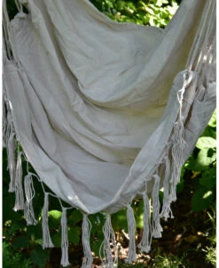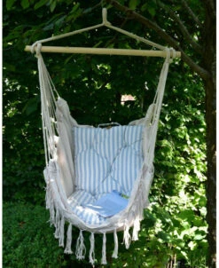 Hangstoel met kwastjes, IB Laursen. Deze leuke hangstoel van een mooie naturel stof heeft een kwastjes rand aan de onderzijde, een naturel houten stok met dik touw als hanger en een heerlijke zitting met hoge rug. De stoel kunt u een leuk plekje geven in huis, op de veranda of in de tuin bijvoorbeeld. U kunt zo in de stoel zitten of er bv een mooi matras kussen in plaatsen voor extra comfort. Een heerlijke stoel om in te wiegen, een boek te lezen en te genieten van rust….. Aan de bovenkant zit een dik touw met een lus erin zodat u hem gemakkelijk kunt ophangen.