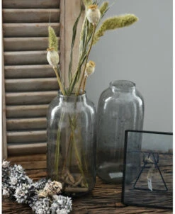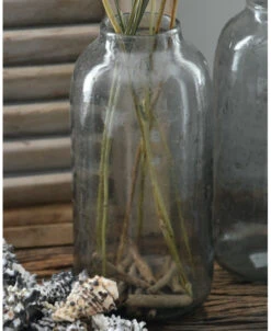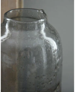 Hoge vaas met bubbels, zilvermetaal en grijze gloed per stuk. Deze leuke glazen vaas heeft een recht opgaand hoog model met een afgeronde iets smallere hals. Het glas is transparant met een grijze gloed en een mooi effect van bubbels en zilvermetaal in het glas verwerkt. De vaas staat heel mooi met enkele takken of droogbloemen die leuk te combineren zijn met wat schelpen en takjes op de bodem van de vaas.