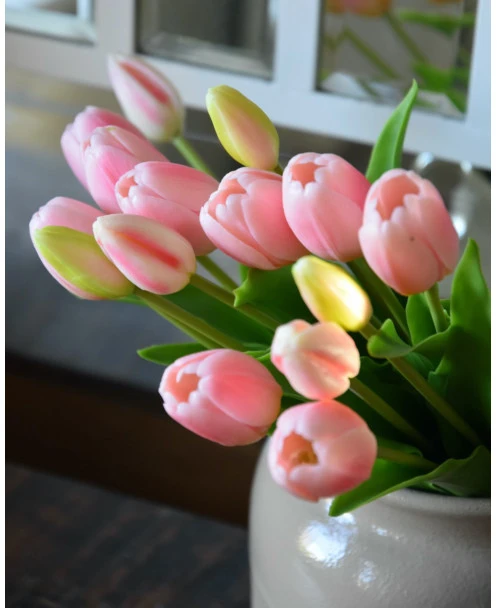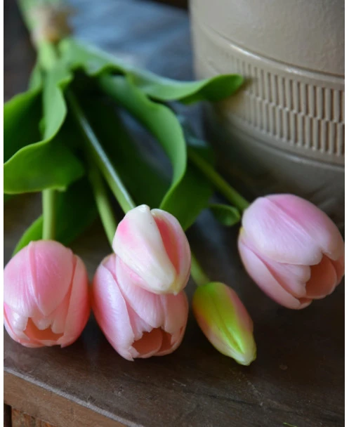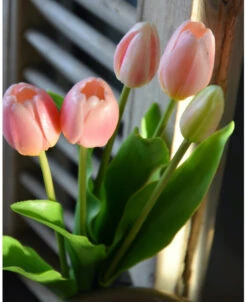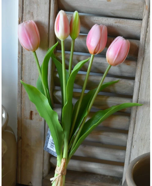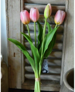 Hollandse roze tulpen bos a 5 stuks. Deze prachtige zijde/kunst tulpen hebben een zacht roze kleur. De tulpen zijn in verschillende stadia van bloei en zijn in de echte Hollandse typerende vorm. De tulpen en het blad voelen vrij echt aan en u kan de tulpen direct gezellig op een vaasje zetten en zo het voorjaar in huis halen. Tip, u kunt de tulpen ook leuk mengen met andere kleuren tulpen.