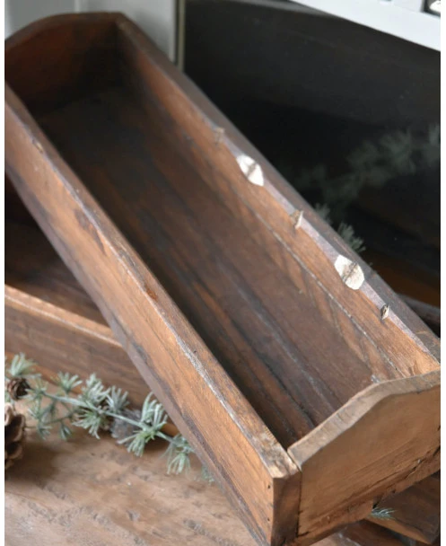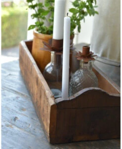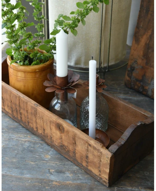 Houten lange bak met bolle uiteinden, Unique, IB Laursen. Deze mooie bak is weer een pareltje die heel veelzijdig is. Het hout is gerecycled en heeft een mooi verouderd uiterlijk. De bak kan leuk op de aanrecht gezet worden met wat kruidenplanten de zoutmolen en een snijplank, of als op de foto met een pot, een plant, wat kandelaren en kaarsen……… Iedere bak is uniek door het hout in tint, maat, model en afwerking doordat het van mooi gerecycled hout is gemaakt, hierdoor krijgt iedere bak karakter en aanzien…..!