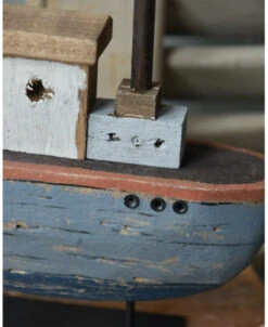 Houten schip op metalen standaard handgeschilderd blauw groot, IB Laursen. Deze leuke decoratieve boot/schip staat op een zwart metalen standaard en is met de hand van hout gemaakt en beschilderd. De boot/schip ziet er iets geleefd uit en is in mooie blauw tinten met stuurhut en al. U kunt de boot een mooie plek geven in de vitrinekast, op het dressoir of tafel.. en combineren met andere boten, schelpen en vuurtorens, om zo een mooie passende sfeer te creëren.